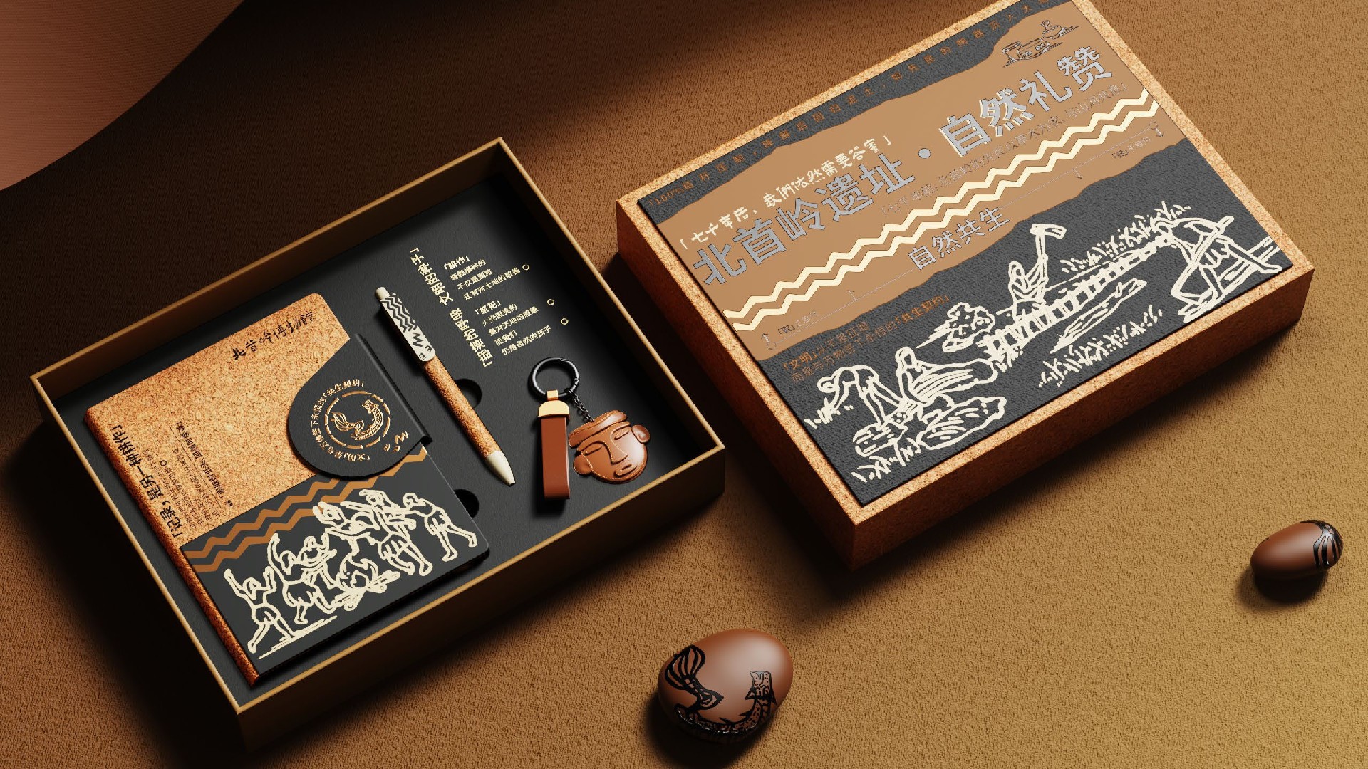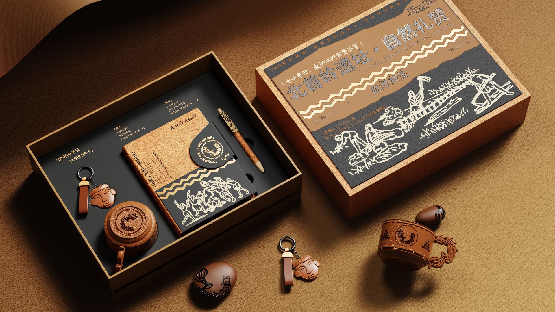 七千年前,北首岭的先民以草木为家,与山河共息。今天,我们以秸秆为纸,复刻远古的智慧⸺取之自然,归于自然。盒面图案以遗址出土文物纹样和原始生活场景为蓝本,描绘了耕作与祭祀的北首岭先民风貌,表达了先民取之于自然,归于自然的生活状态,展现了“索取时低头,回赠时虔诚。”的祭祀信仰。将“生活—自然—信仰”三者串联,形成可触摸的文化符号,同时呼应礼盒“自然共生”的核心理念。通过提取北首岭陶器纹样考古元素,增添文化辨识度。