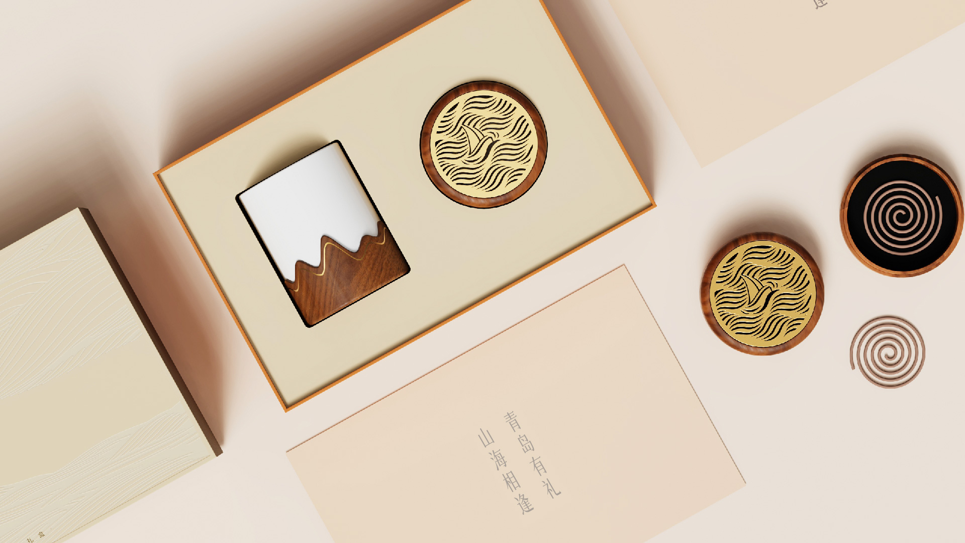 山海自有归期,风雨自有相逢。设计师从中国古代渊源流传下来的香文化中汲取灵感,与现代工艺和材质融合,打造了一款与青岛地域特色相互碰撞的香薰伴手礼礼盒。礼盒由山海杯、熏香、扩香器组成,产品别具一格,海浪、帆船、山脉,皆体现着青岛海滨城市的特色。以雅致氛围与胡桃木,枫木材质构建对质感生活的精准洞察,材质轻巧耐用,精致美观。镂空散香设计,视觉美感和实用性兼具,属上乘礼。匠人匠心古法制香,品香道,礼其心。虚实之间,尽显东方气韵。